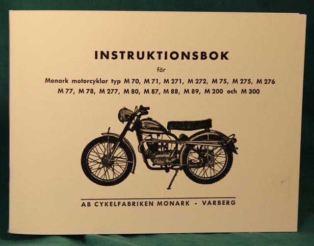 Instruktionsbok för MONARK motorcyklar M70, M71, M271, M272, M75, M275, M276, M77, M78, M277, M80, M87, M88, M89, M200 samt M300.