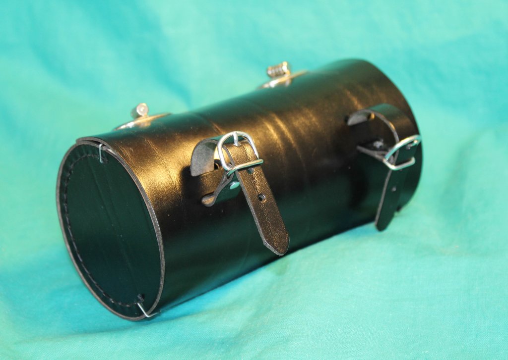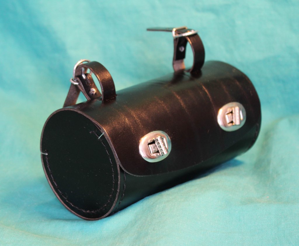 Verktygsväska av svart läder, med cylindrisk form. Kan hängas vid sadeln eller pakethållaren.